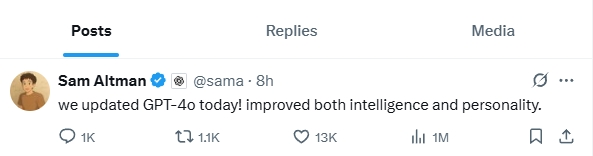 每经AI快讯股壹佰,当地时间4月25日,OpenAI首席执行官山姆·奥特曼在社交媒体上表示,已经升级了GPT-4o模型,目前在智能和个性两方面都有所提升。