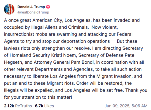 对于愈演愈烈的“围捕战”,特朗普表示,要“结束移民暴乱”,“解放洛杉矶”。